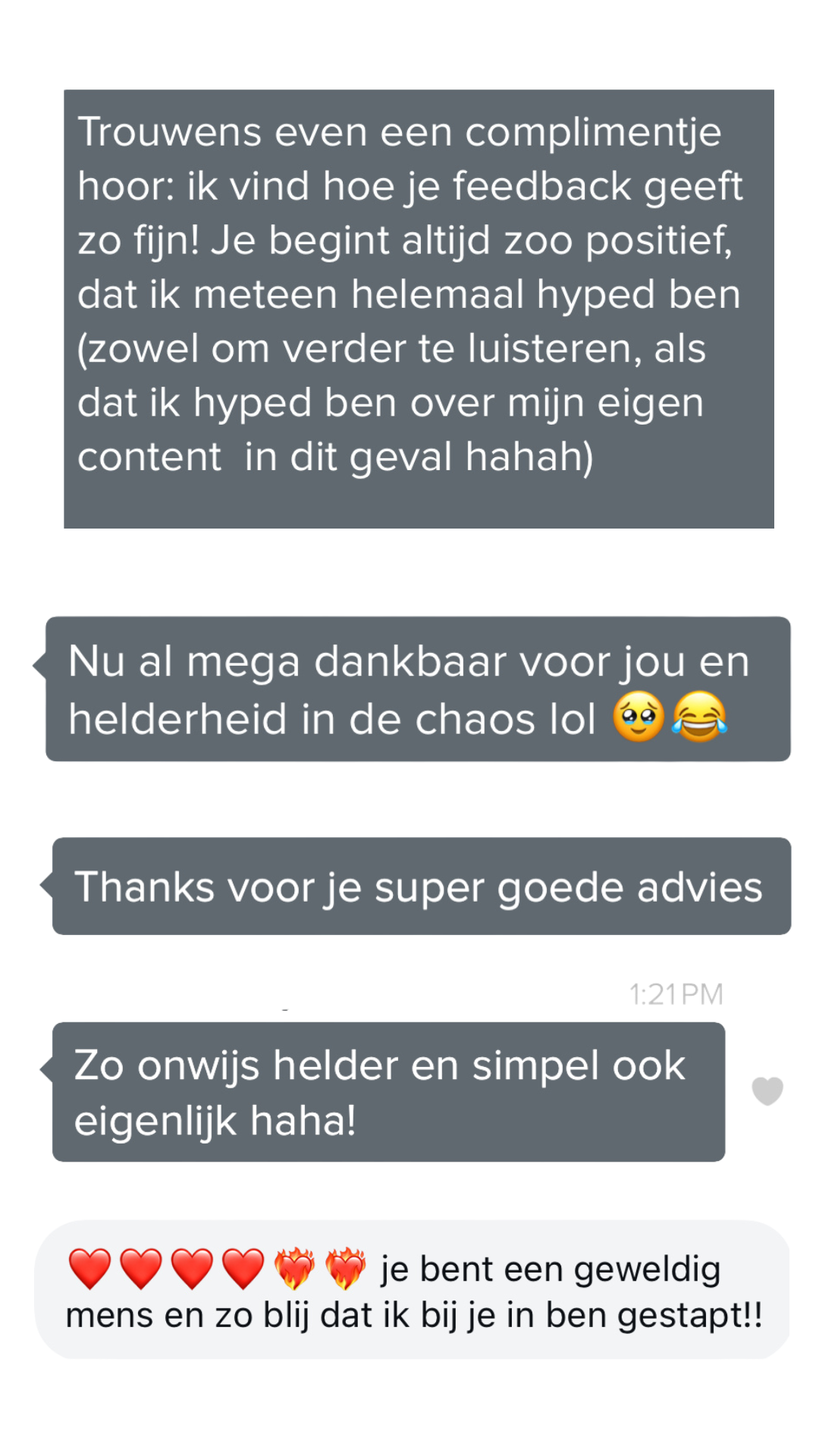 Eén-op-één coaching bij mij betekent ook écht één-op-één. Ik werk met korte lijnen en persoonlijke begeleiding, zodat ik volledig met je kan meekijken naar wat jouw groei nodig heeft. Het zit ‘m vaak in de details: hoe je communiceert, welke keuzes je maakt, en hoe je deze uitvoert. Ook in mijn online programma’s & groepscoaching blijf jij centraal staan. Je kunt altijd rekenen op mijn betrokkenheid en eerlijke feedback. Jouw groei, jouw voorwaarden – daar ligt mijn focus.